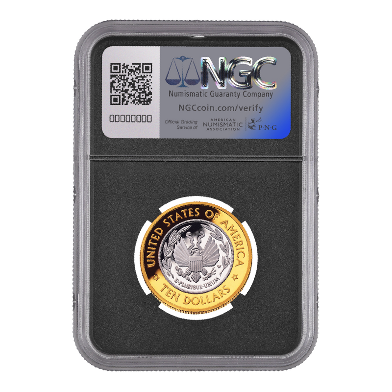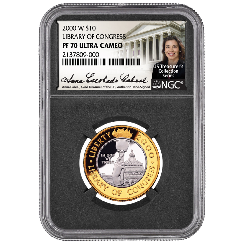 The 2000 Library of Congress Proof 70 Bimetallic Gold and Platinum U.S. Mint Coin, signed by the U.S. Treasurer Anna Cabral, holds the unique distinction of being the first and only bimetallic coin produced by the United States Mint and one of the most sought-after coins issued in the new millennium. The center of this coin is minted from a quarter ounce of pure platinum and the outer ring is struck in one quarter ounce of pure gold. The reverse is beautiful with the Heraldic Eagle highlighted in beautiful platinum ringed in solid gold.