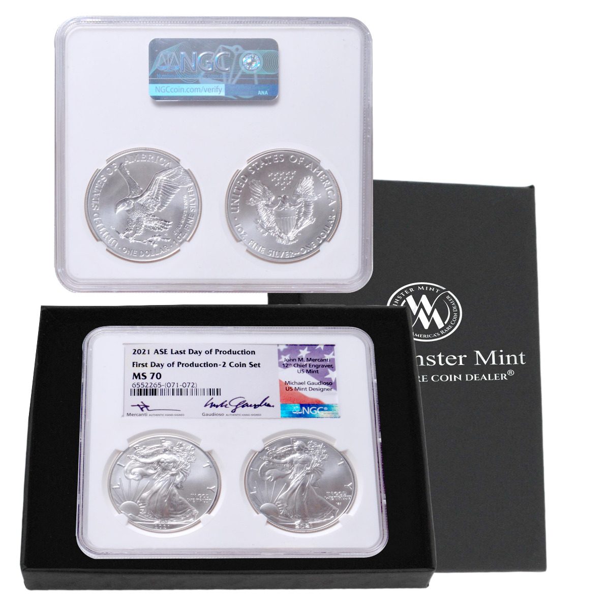 2021 $1 1-oz Silver Eagle T1 Last Day & T2 First Day of Production 2-pc Set NGC MS70 Mercanti/Guadioso Signatures