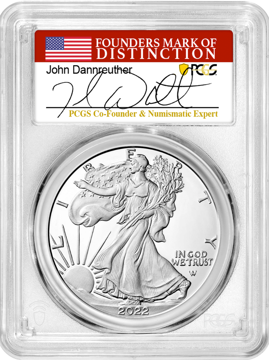 2022 S Silver Eagle PCGS PR70 Advance Release – Founders Mark of Distinction Label