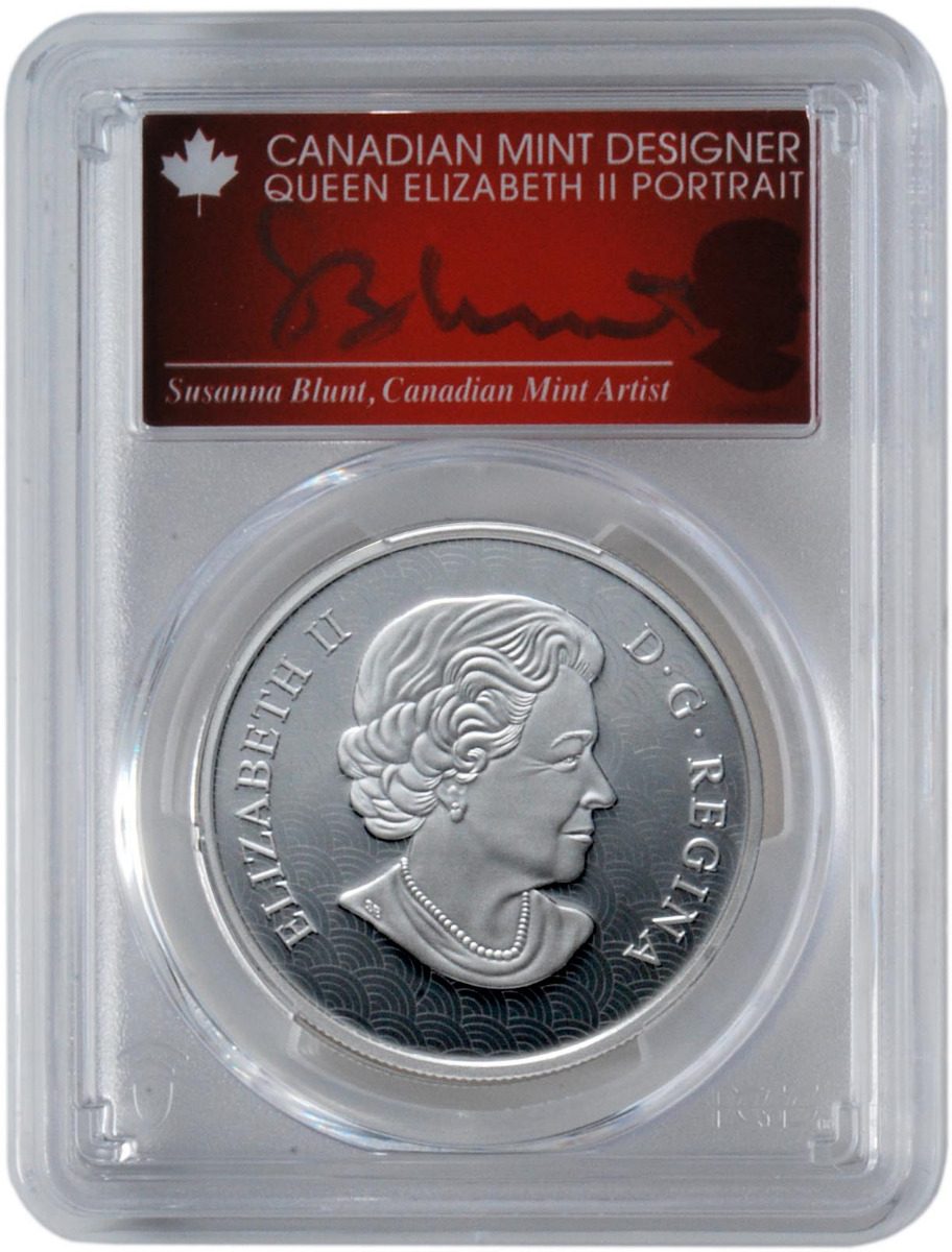 We offer the coin certified in perfect PR70 Deep Cameo condition by PCGS. This coin has the First Day of Issue designation that collectors look for. The image of Queen Elizabeth II, shown for the first time without a crown or tiara was created by the Canadian portrait artist Susanna Blunt at the request of the Queen who thought not wearing a crown would make her more approachable.
