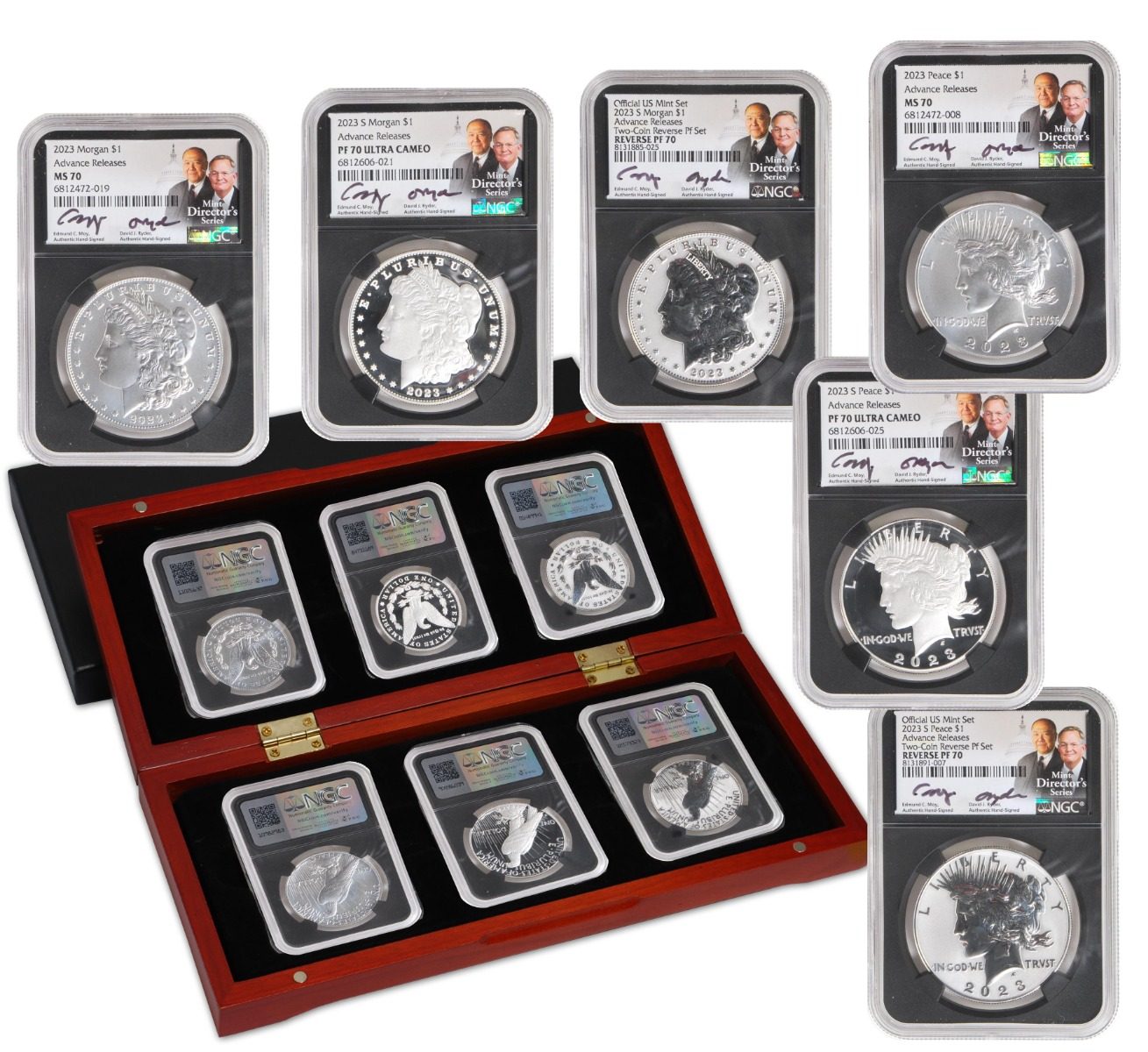 This complete six-piece set comprises a Morgan and Peace silver dollar coin with three different strikes creating a stunning visual effect. Each coin is certified in perfect 70 condition, the highest numeric numismatic grade any coin can achieve by NGC. The coins in this set have the coveted, limited edition Advance Releases designation, an official U.S. Mint term.