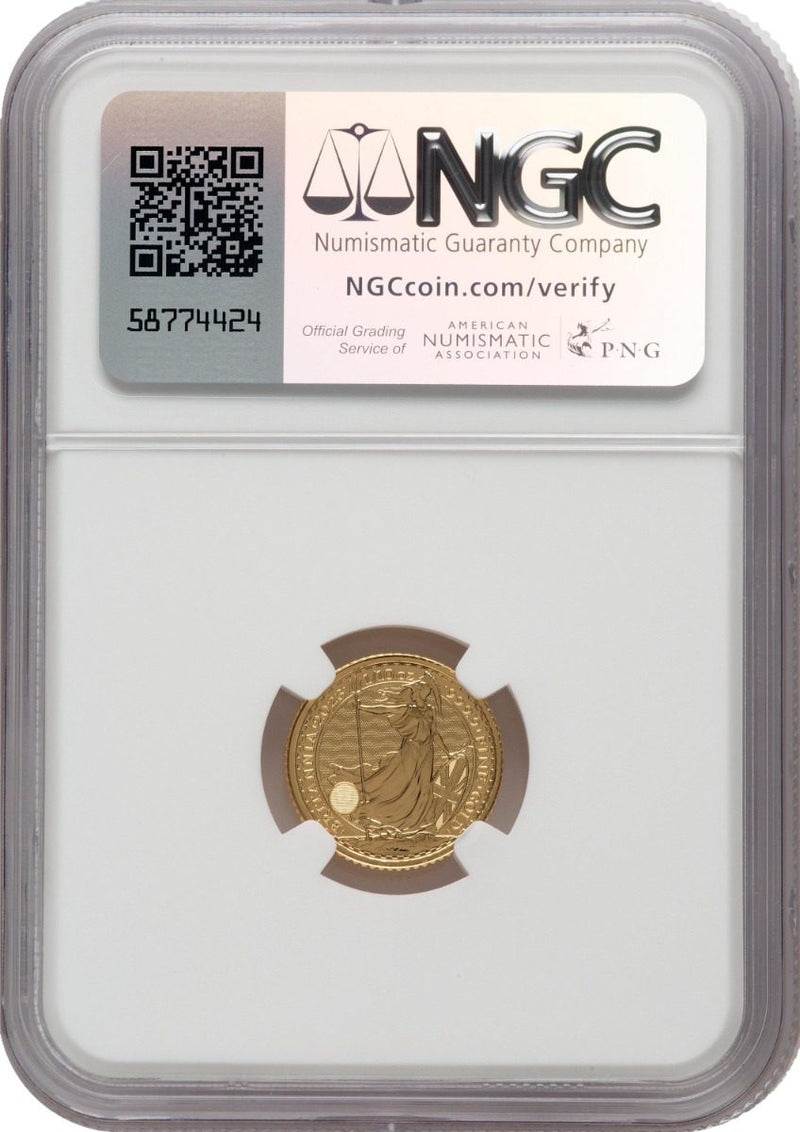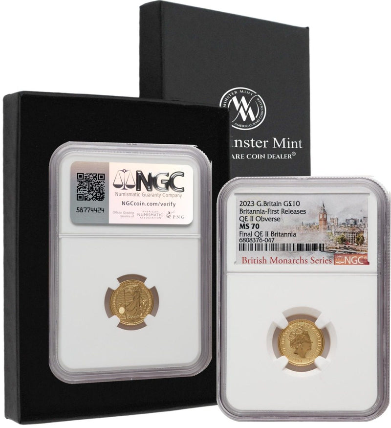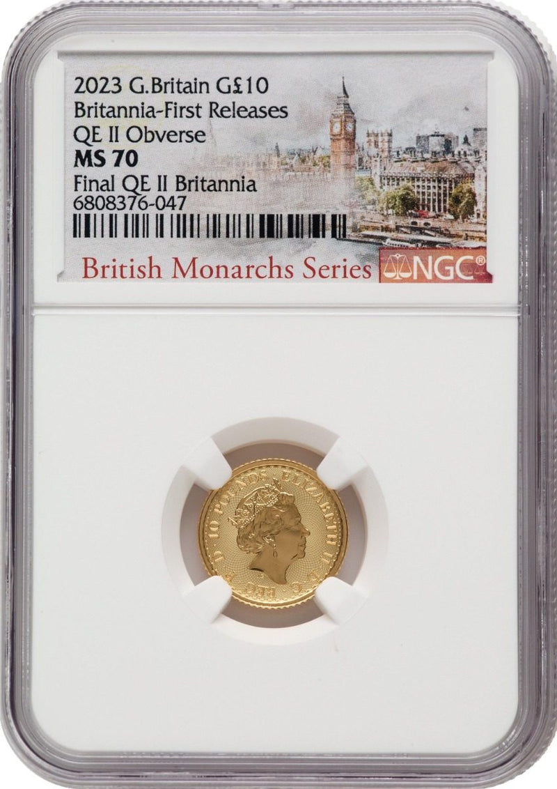 This 2023 £10 Gold Britannia coin features the final effigy of Her Majesty Queen Elizabeth II to appear on the beloved Britannia, the Royal Mint’s flagship gold coin series. Britannia is the proud symbol of Great Britain since Roman times. An effigy of Queen Elizabeth II has appeared on 29 billion coins from thirty-five countries spanning five continents, more than any other person in history.