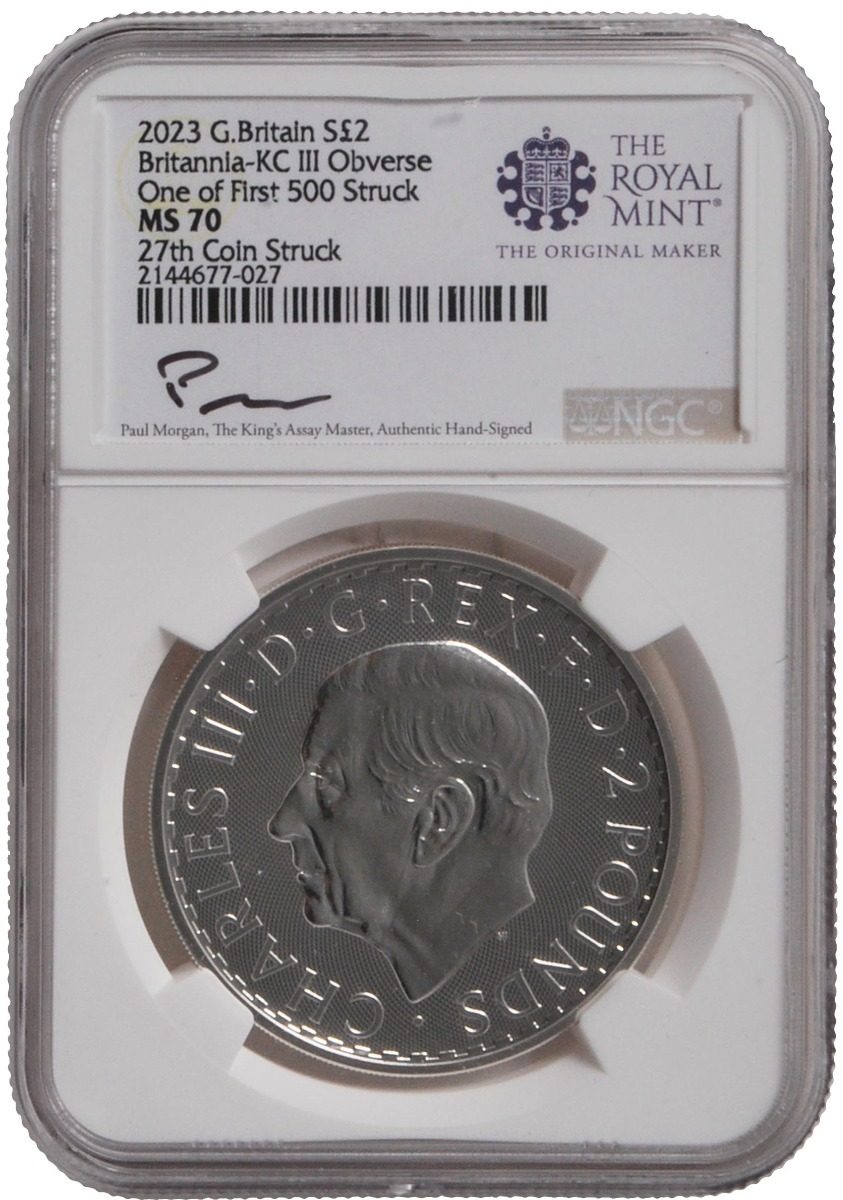 The very first Silver £2 Silver Britannia with the King Charles III portrait, which is graded NGC MS 70 sold for $18,000.