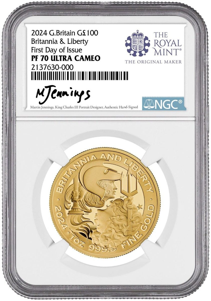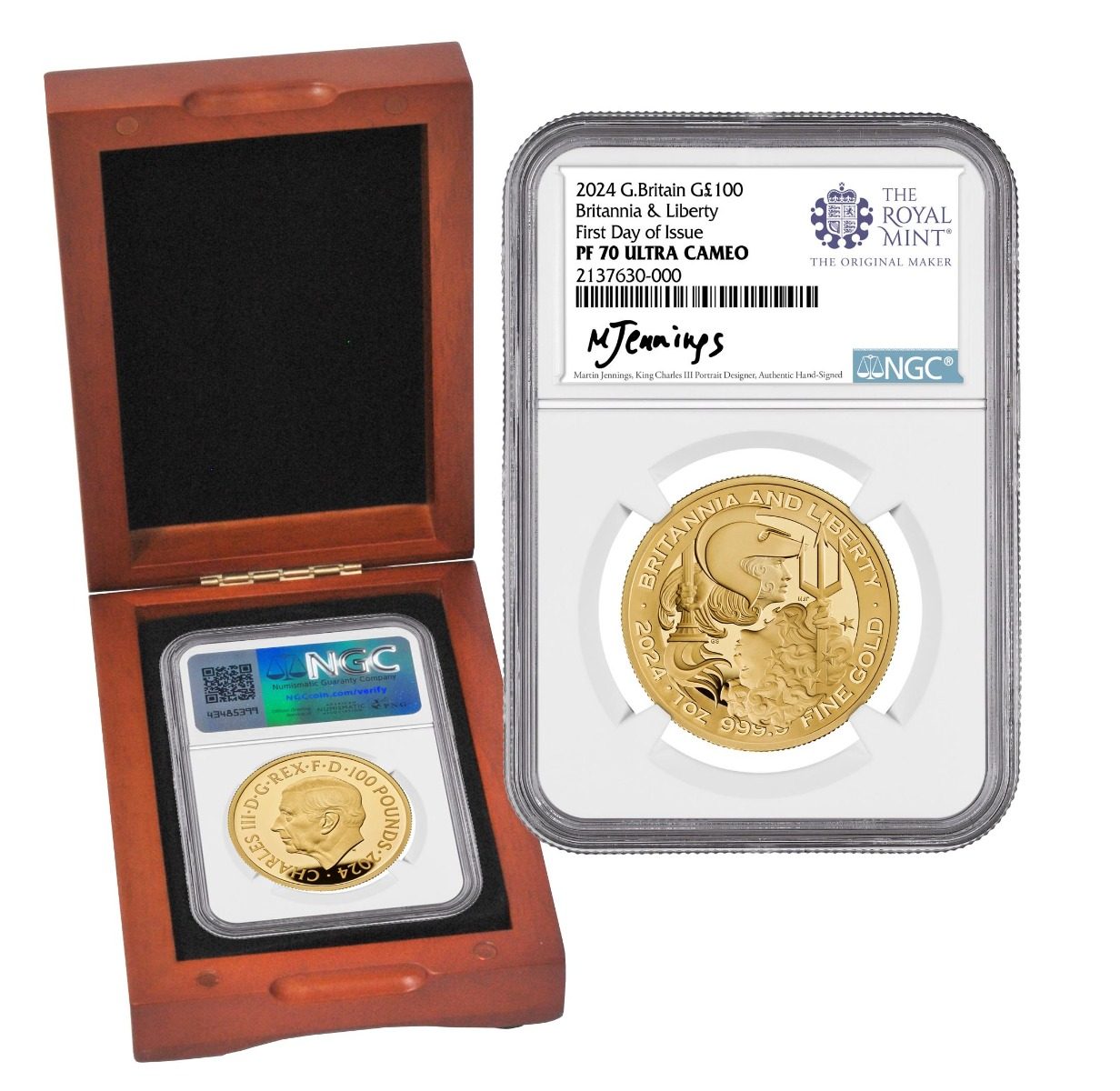 This 2024 Britannia Liberty gold proof is a masterpiece, and the series highlight proof coin issued in the historic collaboration between the United States Mint and the British Royal Mint, two of the oldest and largest mints in the world.