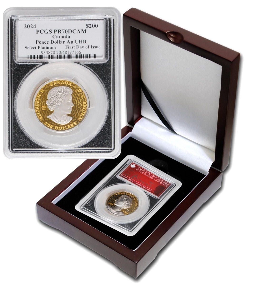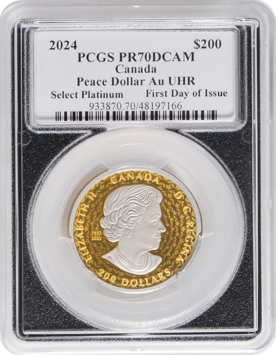 This 2024 Canadian Mint Peace Dollar is minted in one ounce of .9999 pure gold and has a high face value of $200. Only 650 coins were minted with a special Ultra High Relief strike giving a 3-dimensional appearance. Another feature is that select parts of the design have been layered in platinum. With only 650 coins minted each legal tender piece is an absolute rarity. PCGS has certified this coin in perfect PR70 DCAM condition with the coveted First Day of Issue provenance. It is one of a small number of coins signed by Susanna Blunt, who designed the portrait of Queen Elizabeth II that appears on all legal tender Canadian coinage.