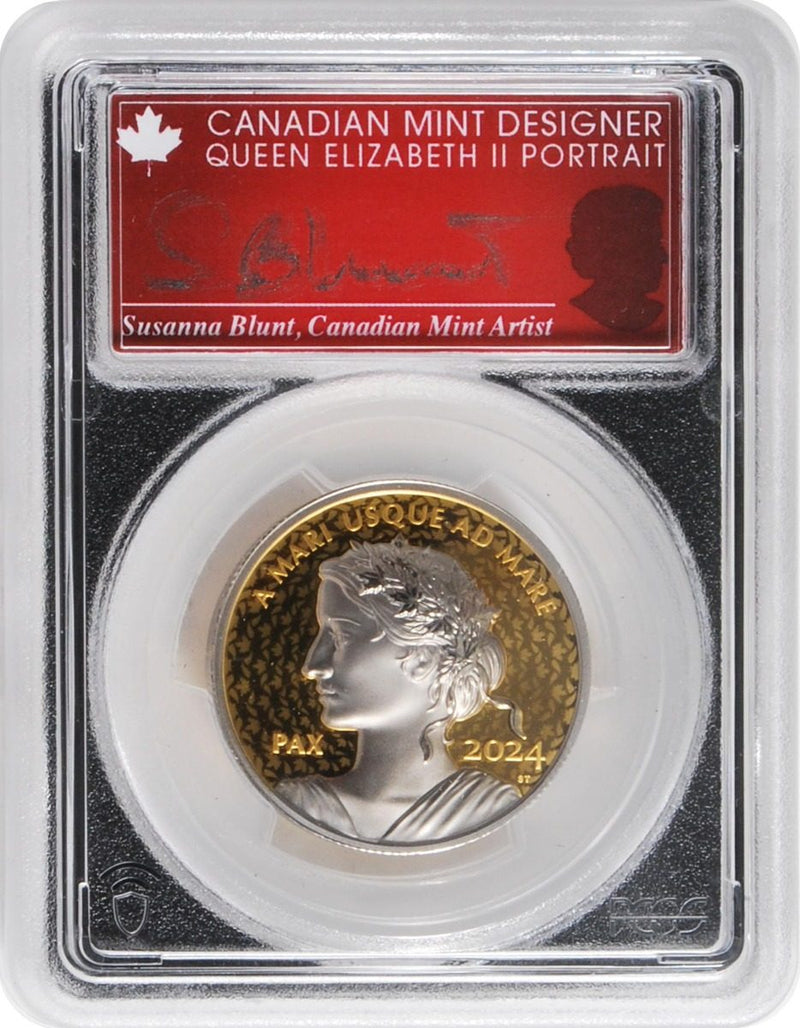 Lady Peace is depicted in profile with her hair crowned in a wreath of olive branches and maple leaves. She is flanked by her name “PAX” (the Latin word for “Peace”) and the year “2024”, while Canada’s national motto, “A MARI USQUE AD MARE” (“From sea to sea”) appears overhead. The obverse features selective gold layering and the effigy of Queen Elizabeth II by Susanna Blunt.