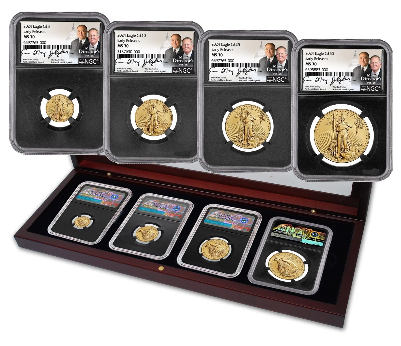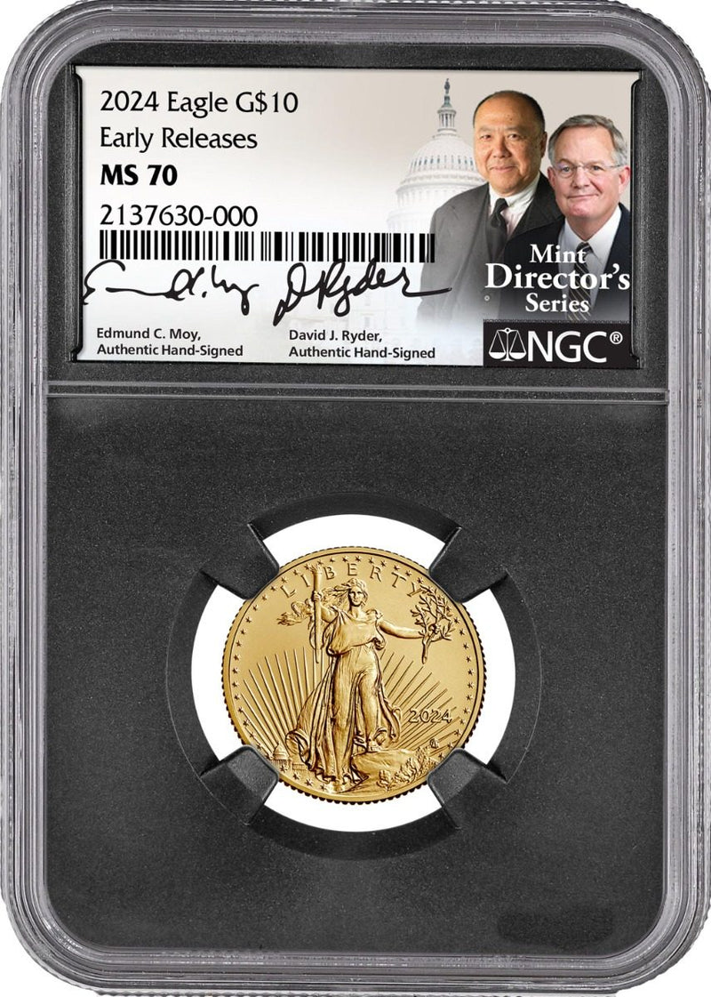 This four-piece collection is part of the NGC U.S. Mint Directors Series of top U.S. collectible coins. Certified in perfect MS70 condition, each coin is hand signed by Edmund C. Moy and David Ryder, two of only thirty-seven people to have held the esteemed position of United States Mint Director since its founding in 1872. The Moy/Ryder signatures are the best known in all of numismatics and are closely associated with the advancement in the American Gold Eagle Series. Facsimile signatures of Edmund C. Moy and David Ryder have appeared on U.S. Mint Certificates of Authenticity since 1994. These are the real authentic hand signed signatures!
