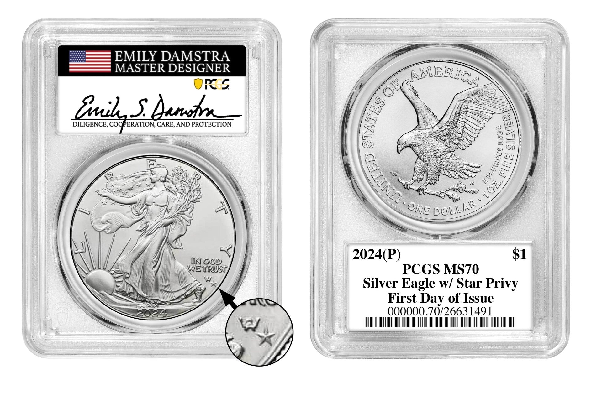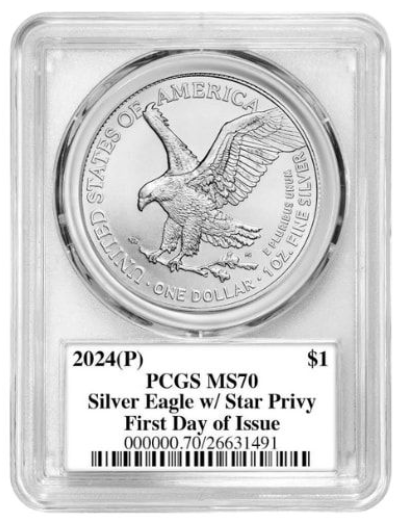 The 2024-(P) PCGS MS-70 First Day of Issue Star Privy 1 oz American Silver Eagle Coin is an exciting addition to the American Eagle Series, combining numismatic excellence with a unique partnership between the U.S. Mint and the video game company Nice Gang. This coin is limited to just 500,000 pieces, making it a valuable collector's item.
