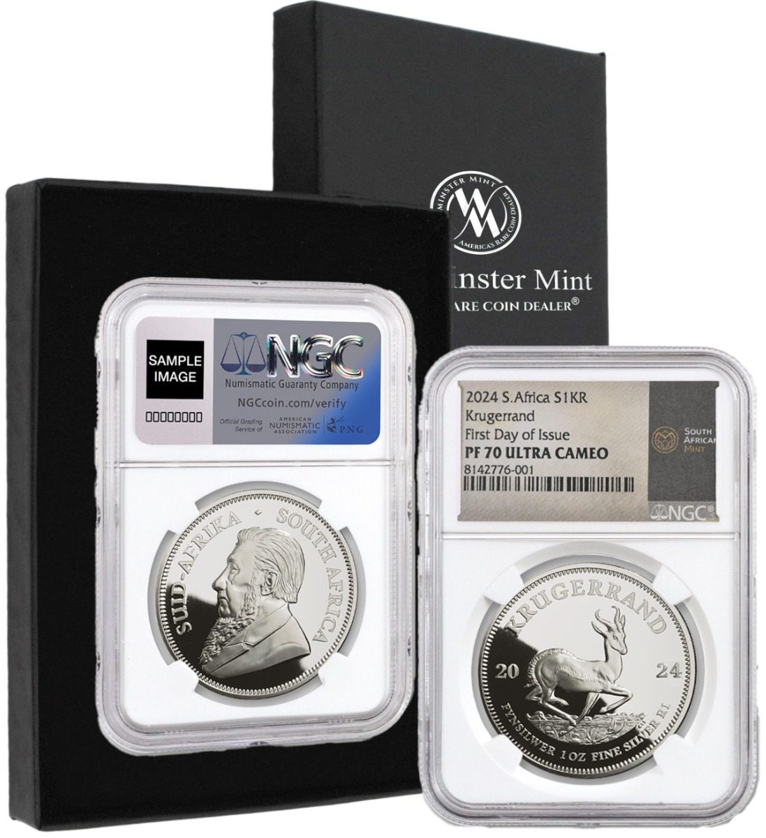 This rare 2024 Silver Krugerrand Proof coin holds the unique distinction of having the lowest mintage in the series! Only 5,000 coins were minted for worldwide distribution. NGC has certified this desirable coin in perfect PF70 condition with the valuable First Day of Issue designation that collectors look out for.