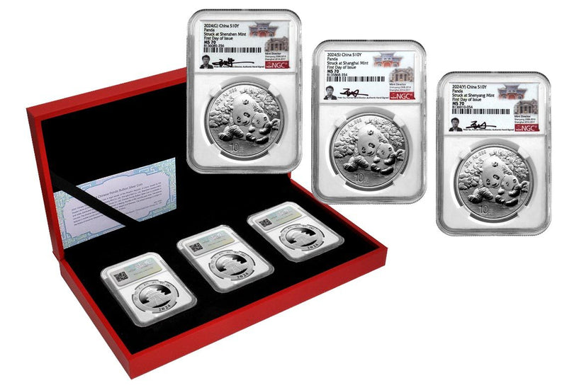 A unique feature of silver Panda coins is their intricate designs featuring Panda bears that changes every year creating a unique collectible. Panda coins are made with the highest minting qualities to ensure every detail is as visible as possible. This exceptionally limited set comprises a coin minted by each branch of the China Mint, the Shenzhen (G), Shanghai (S), and Shenyang (Y) Mint.