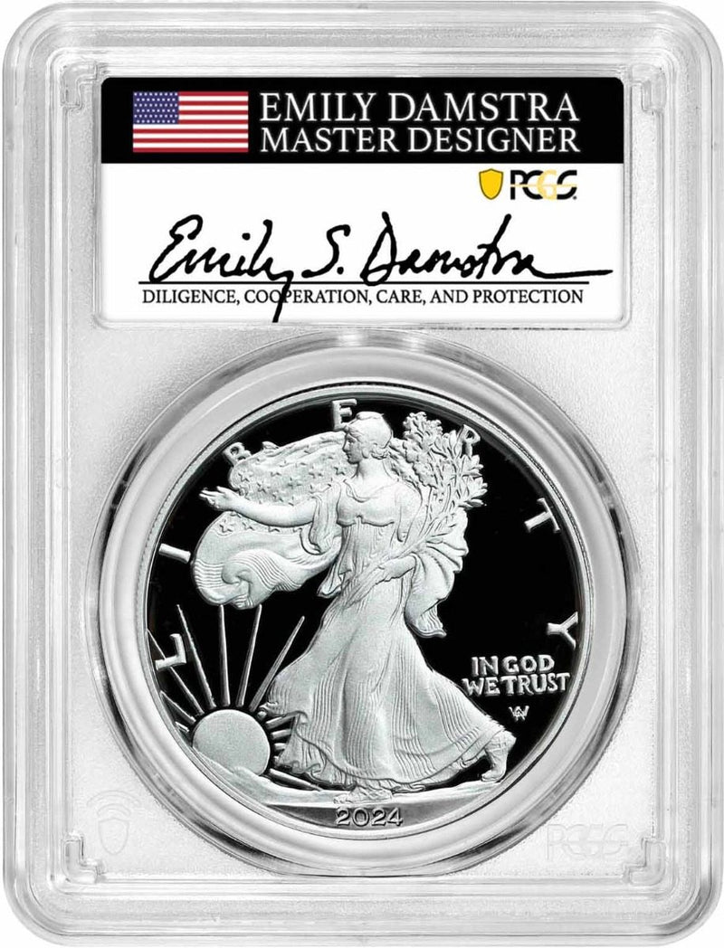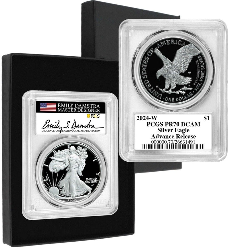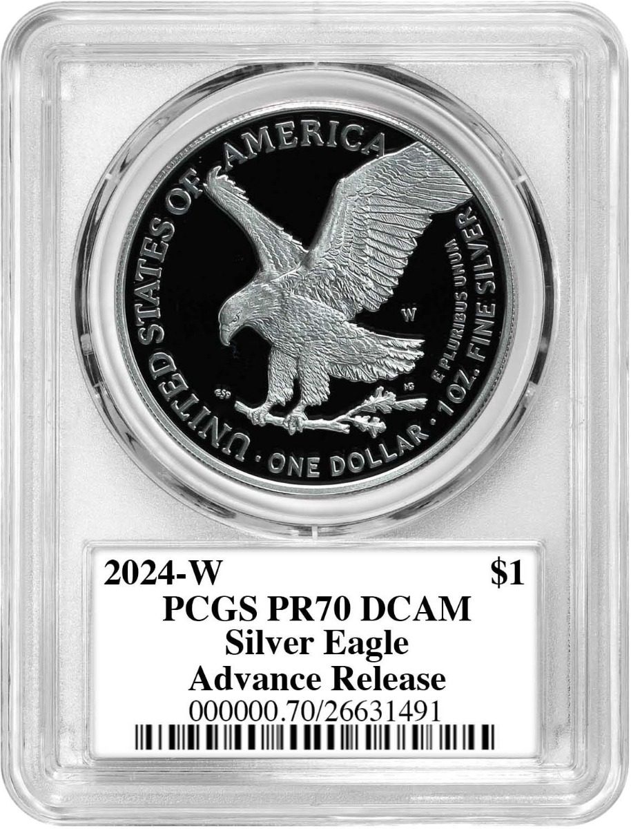 Proof coins are struck in limited quantities just for collectors. This new 2024 release minted at the West Point Mint and bearing the W mintmark is the ultimate coin for Silver Eagle collectors! PCGS has certified this piece in perfect PR70 Deep Cameo condition, the highest numeric numismatic grade possible. From an authorized mintage of 450,000 coins, only 45,000 coins are designated by the United States Mint as Advance Release coins. Eligible coins are sent to coin grading services like PCGS ahead of the official release date and a graded in limited quantities ahead of coins designated as First Day of Issue coins!