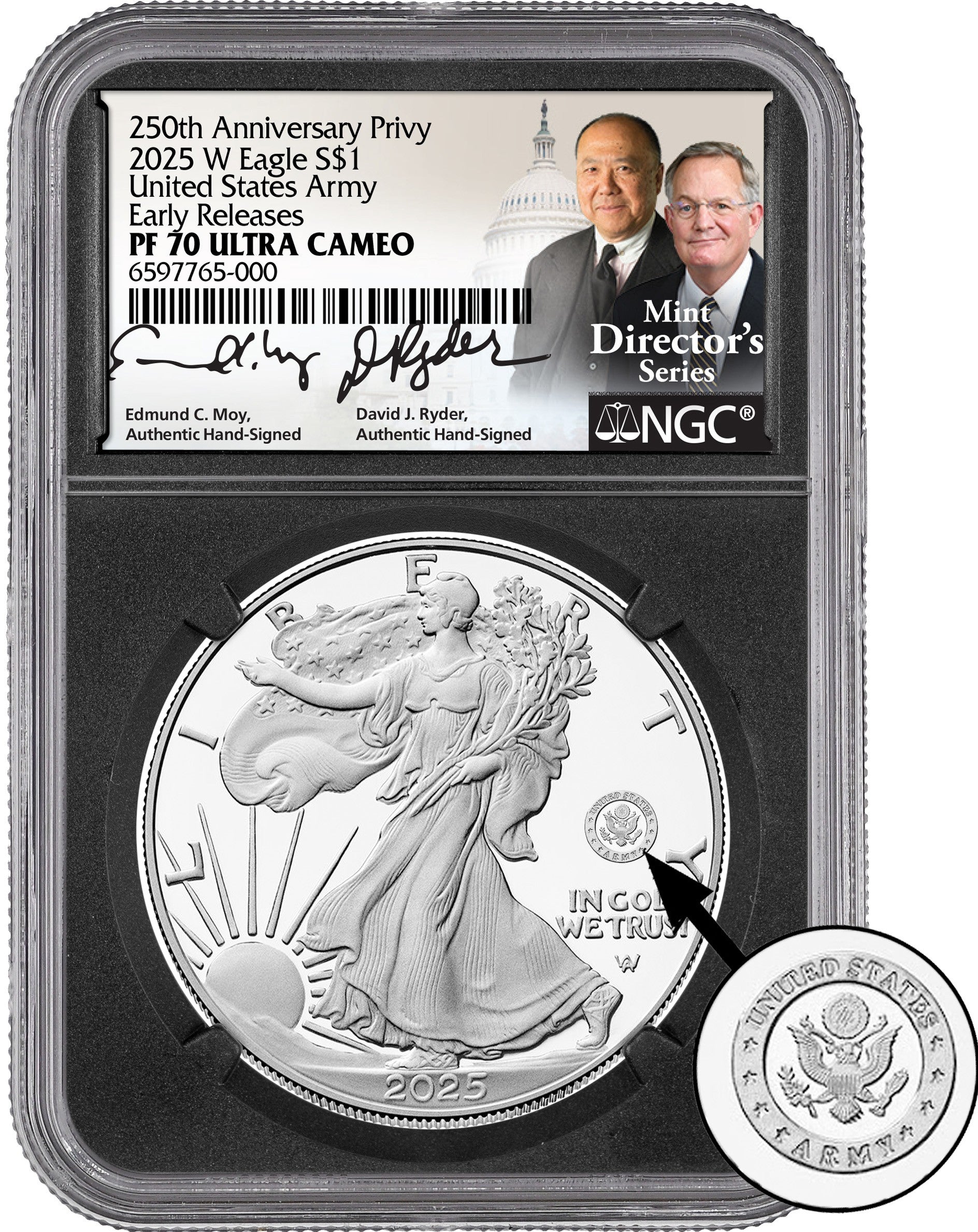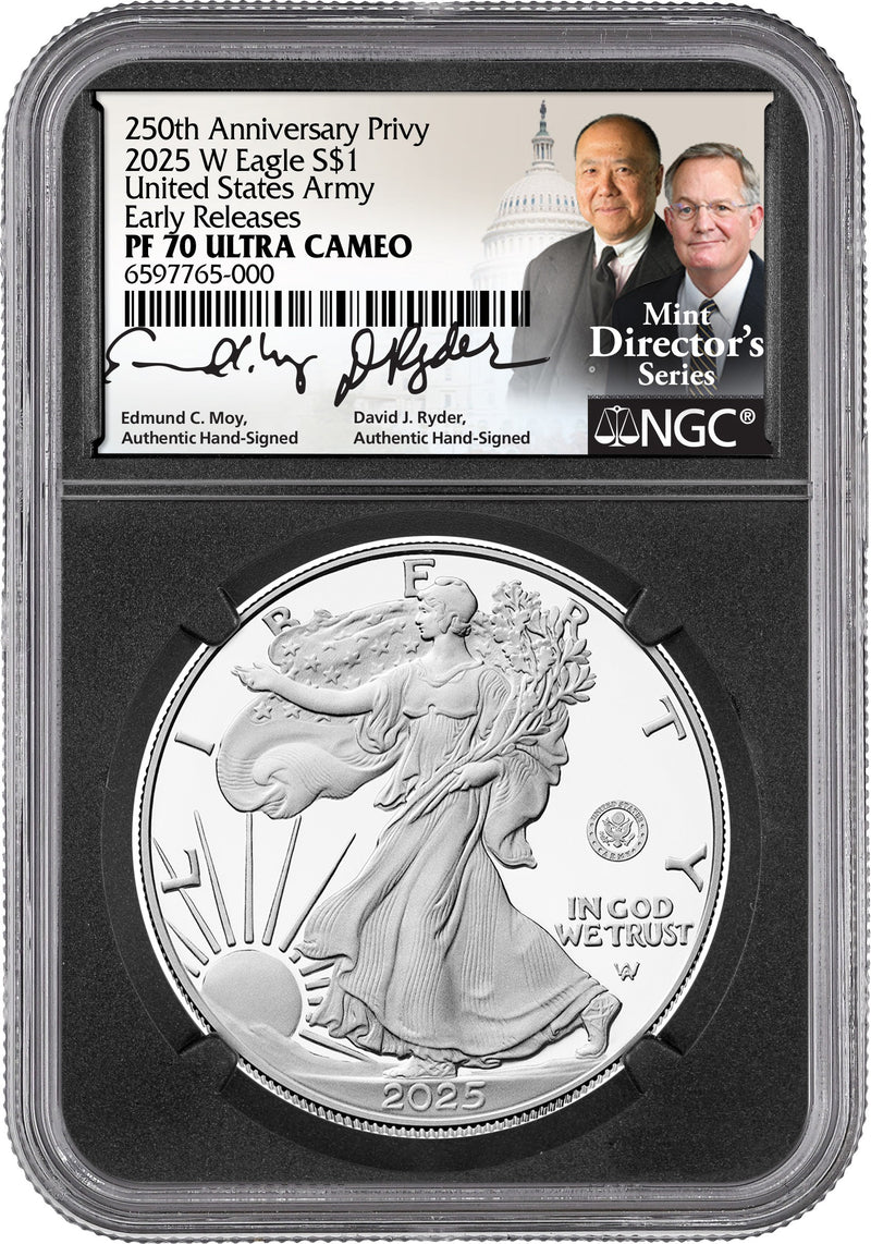 The 2025 Silver Eagle with Army Privy Mark is more than a numismatic treasure — it’s a powerful tribute to 250 years of U.S. Army history. With its perfect NGC PR70 Ultra Cameo grade, Early Release certification, and dual autographs from two influential Mint Directors, it represents a once-in-a-generation collectible honoring America’s oldest military branch.