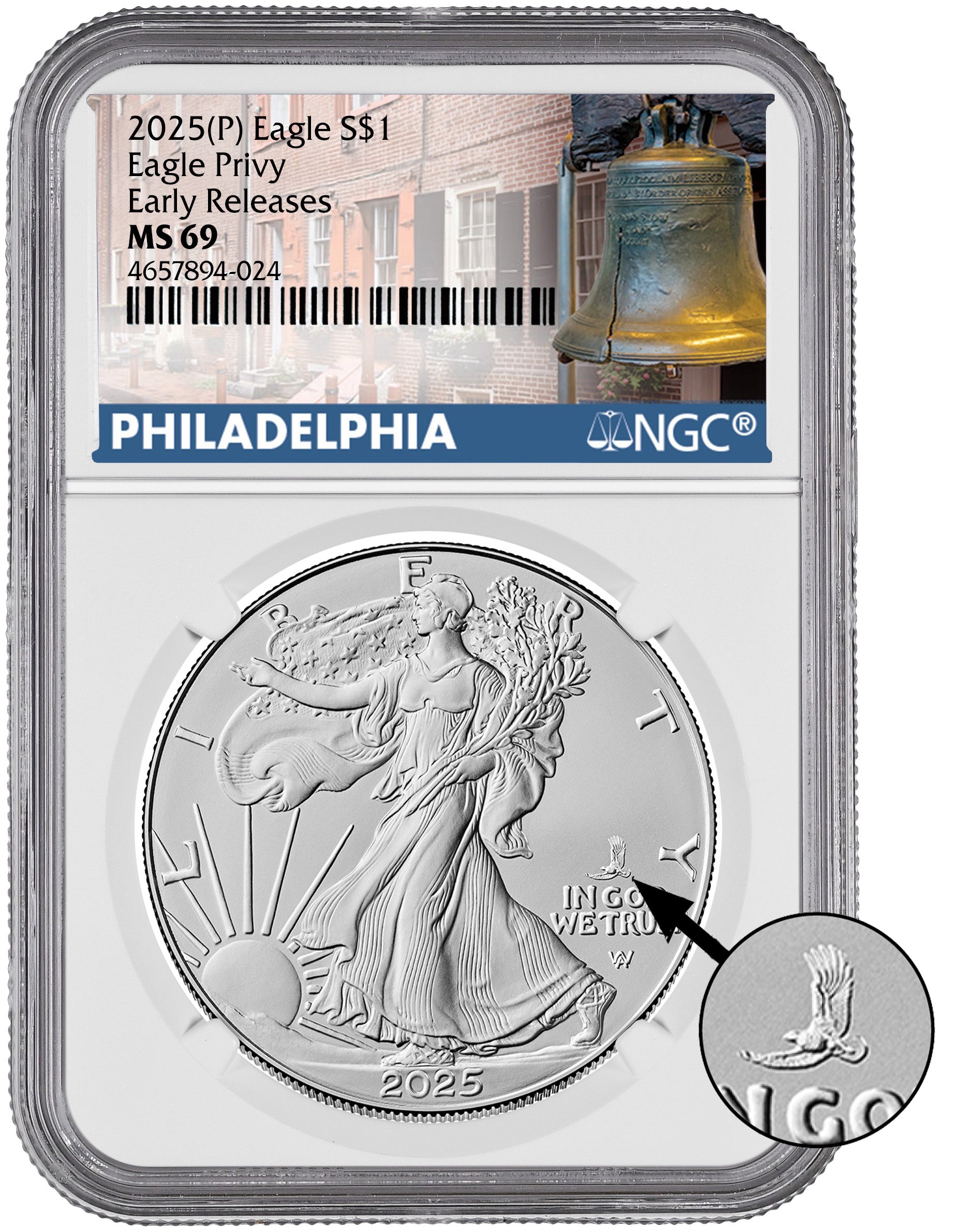 This beautiful coin has a tiny mintage of only 500,000, which is the lowest mintage on record for any Uncirculated Silver Eagle. Each coin has a special privy mark featuring an American Bald Eagle that sets it apart from every silver dollar ever struck by the U.S. Mint. We showcase this modern-day rarity in near perfect Mint State 69 Grade with a special Liberty Bell certified holder. Pick up a few today while they last!