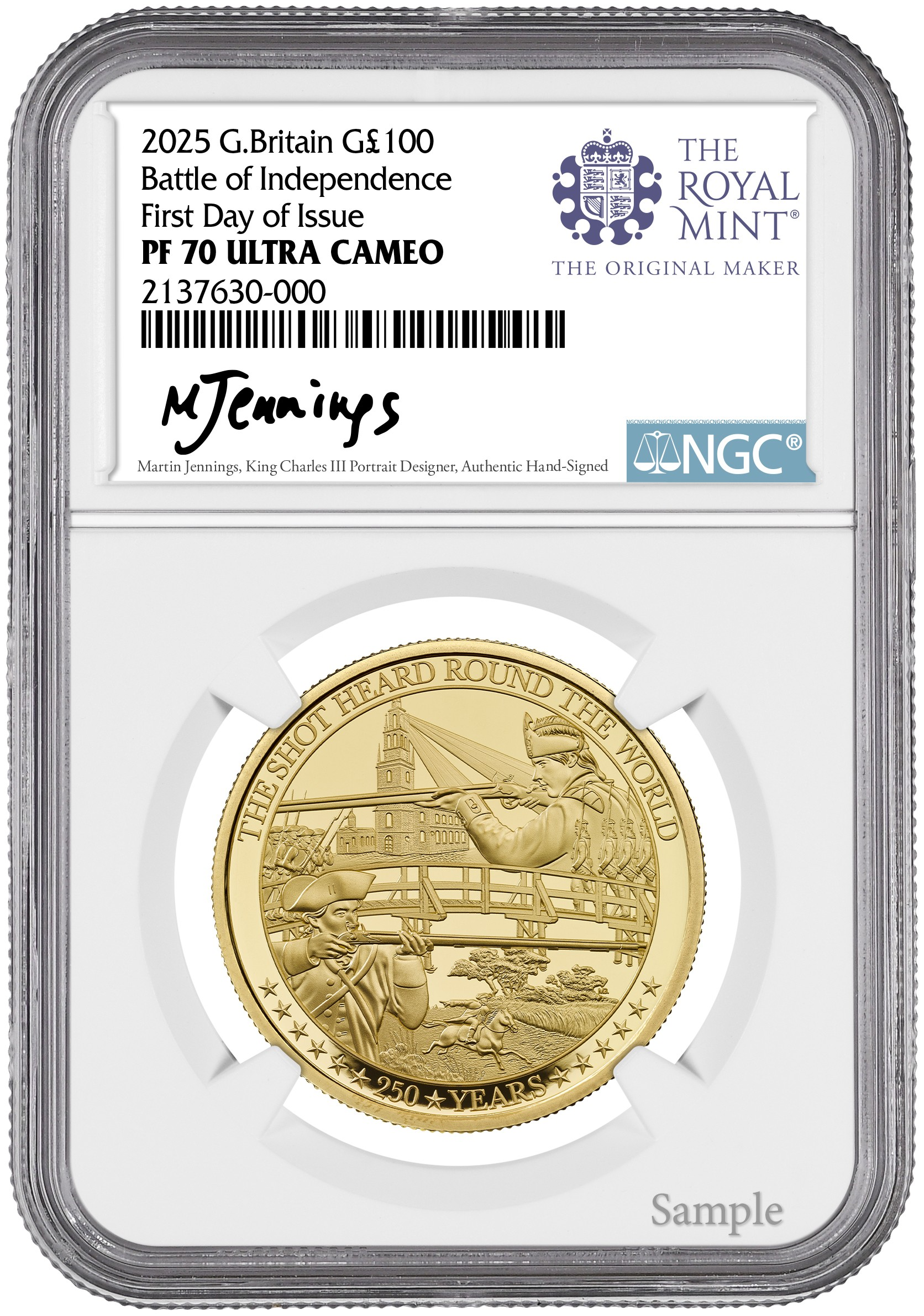 The first time a UK coin pays tribute to the history of the American Revolutionary War. Struck in 1oz of 999.9 gold to mark the 250th anniversary of the Battles of Lexington and Concord. Created by Michael Gaudioso, the reverse design pays homage to key elements of the battles. The inscription on the reverse features the famous phrase ‘THE SHOT HEARD ROUND THE WORLD’. Complemented by bespoke packaging that explores the significance and historical context of the Battles of Lexington and Concord.