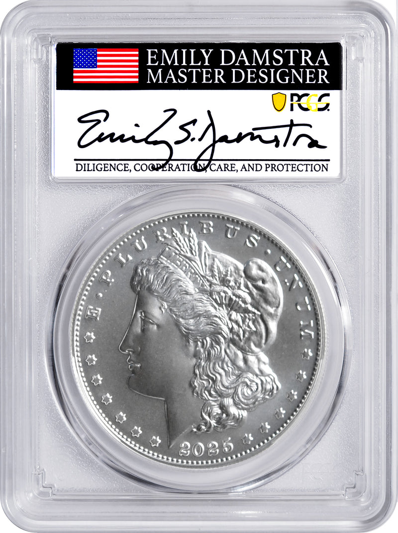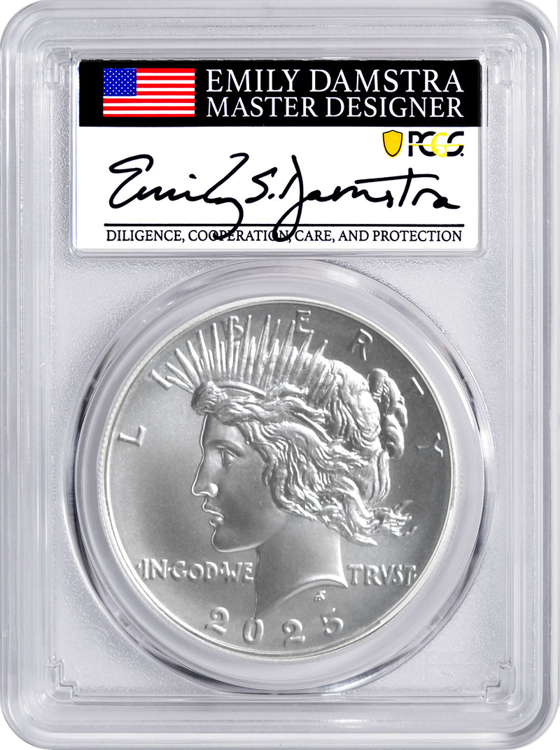 The legacy of America’s most beloved silver dollars continues with the 2025 Morgan and Peace Dollar Set, each certified MS70 by PCGS and designated First Day of Issue. These modern strikes pay tribute to the original designs that defined a golden era of American coinage — and now, they return in perfect condition, bearing an exclusive signature from U.S. Mint designer Emily Damstra.