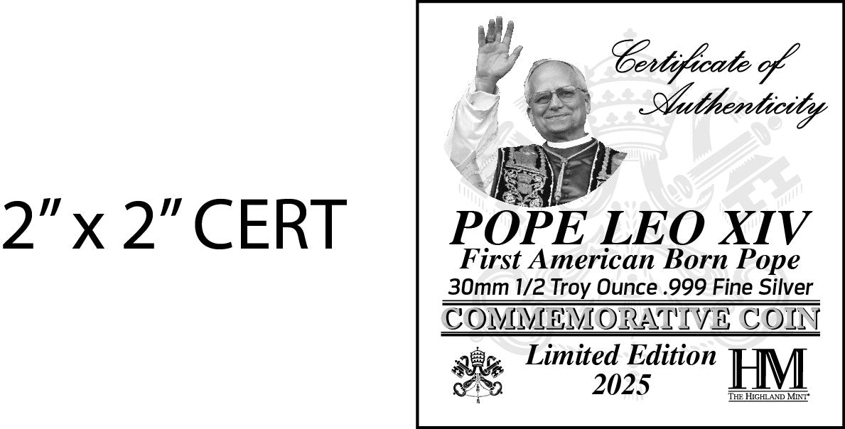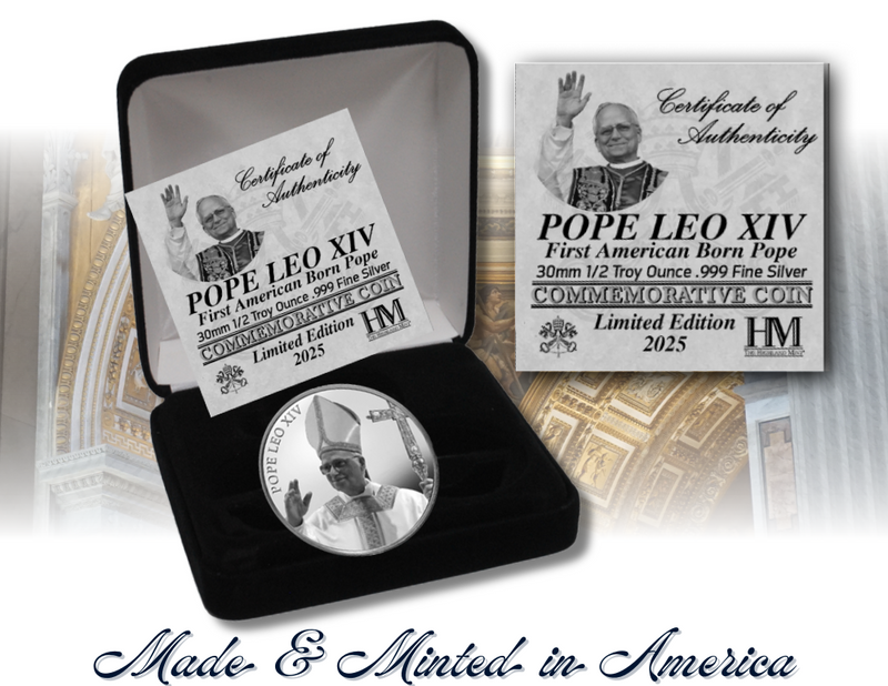 Celebrate this pivotal moment and archive the landmark event for this generation! Now you can own your own piece of history and create a silver legacy with this beautiful, pure silver Pope Leo XIV coin! Struck in the U.S.A from one half ounce of pure .999 silver, this stunning coin depicts the 267th Pope with vivid detail. Call 1-800-301-3868 now to secure your Pope Leo XIV coins, limited to only 2025 minted pieces! Ask about the Gold Pope Coins and our special collector sets!