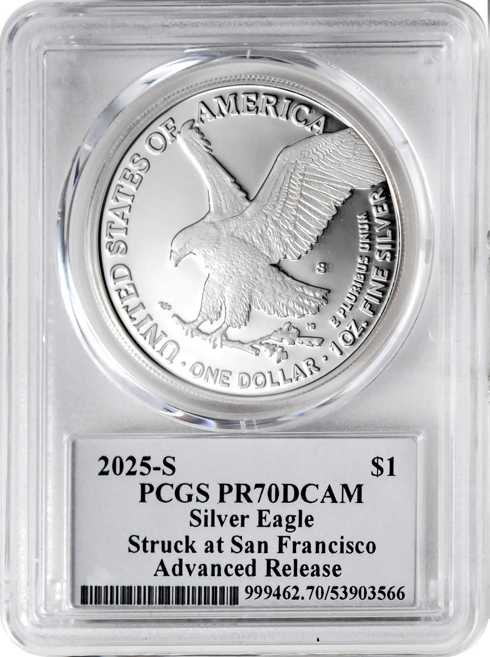 The 2025 American Eagle Silver Proof Coin, certified Proof 70 Ultra Cameo, is the final Silver Eagle Proof to be struck at the San Francisco Mint. Produced in 1 oz. of .999 fine silver, this historic release marks the conclusion of a significant chapter in the American Silver Eagle series.