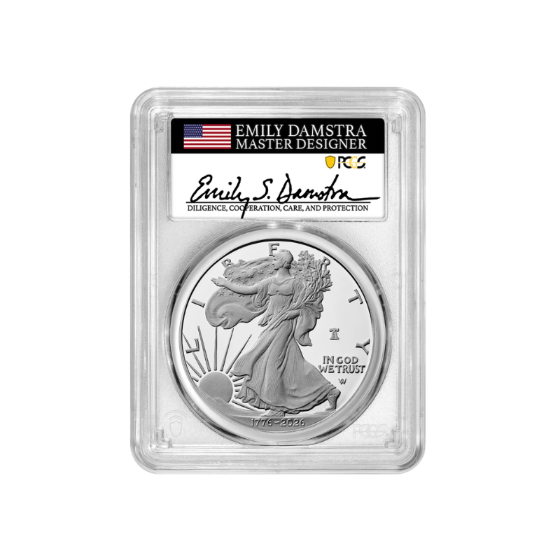 Each coin includes an official Emily Damstra signature label, personally hand-signed by the acclaimed artist behind the Type 2 Silver Eagle reverse.