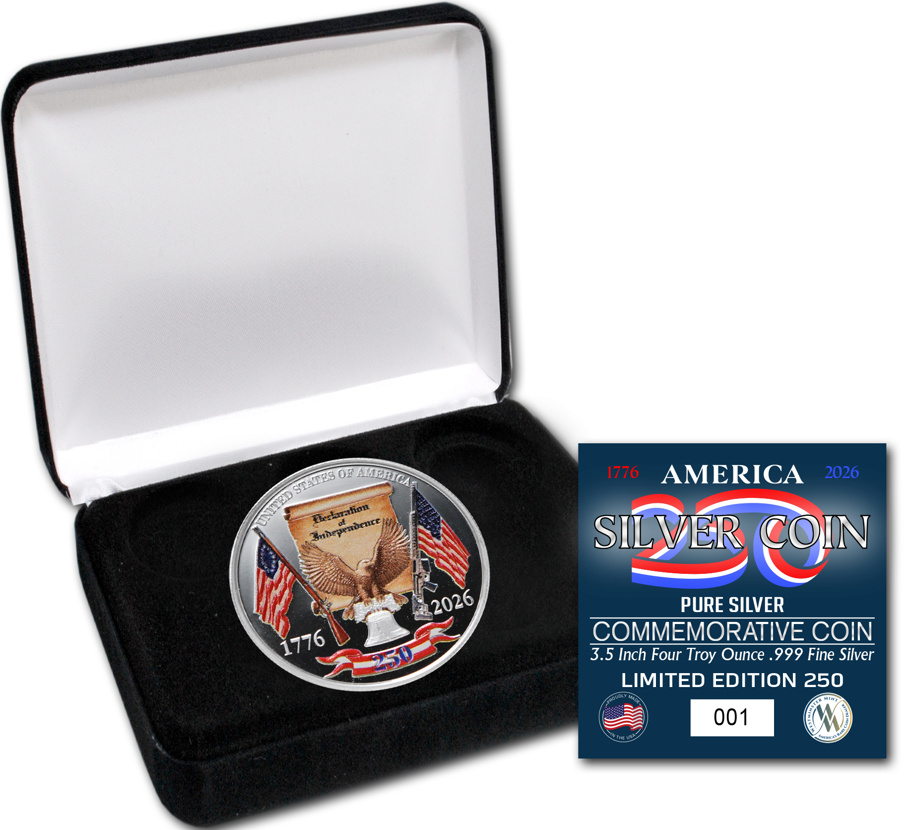 Celebrating the historic milestone of 250 years in America, we are excited to present the exclusive, America 250 Coin struck in four ounces of .999 pure silver. PROUDLY MADE IN THE U.S.A. These historic pieces are individually numbered out of ONLY 250 PIECES MINTED with a matching, numbered certificate of authenticity. Secure your own silver legacy with this beautiful coin that comes to life in eye popping, state-of-the-art UV color. Very limited mintage and massive collector demand means that these pieces will simply not last.